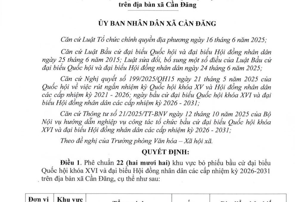 QUYẾT ĐỊNH VỀ VIỆC PHÊ CHUẨN KHU VỰC BỎ PHIẾU BẦU CỬ ĐẠI BIỂU QUỐC HỘI KHOÁ XVI VÀ ĐẠI BIỂU HỘI ĐỒNG NHÂN DÂN CÁC CẤP NHIỆM KỲ 2026-2031 TRÊN ĐỊA BÀN XÃ CẦN ĐĂNG
