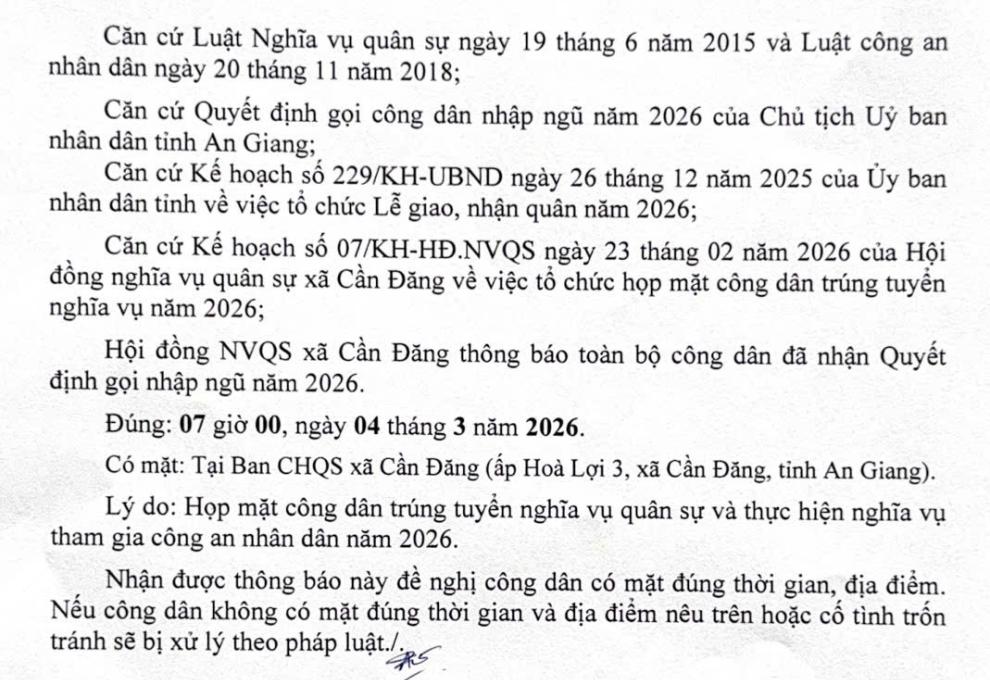 Về việc tập chung công dân trúng tuyển nghĩa vụ quân sự và thực hiện nghĩa vụ tham gia công an nhân dân năm 2026