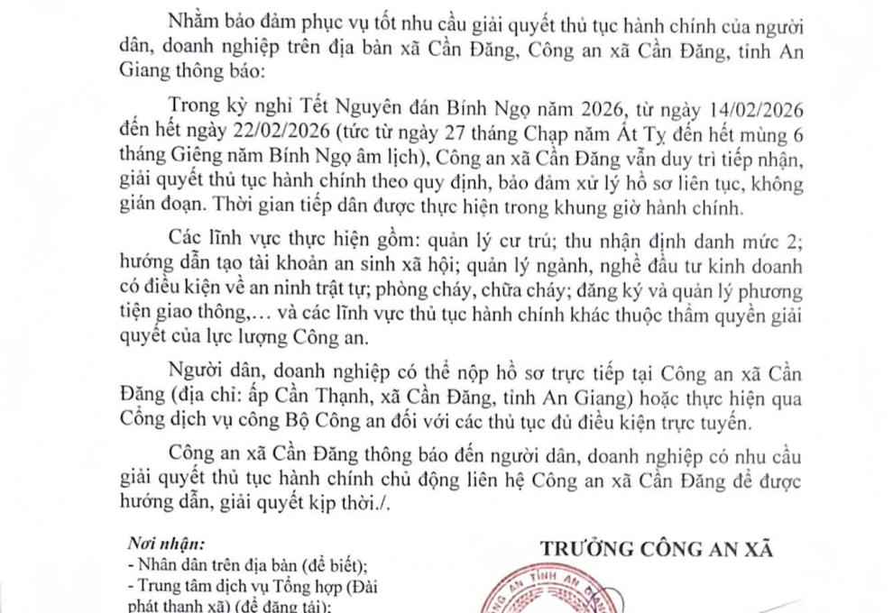 THÔNG BÁO VỀ VIỆC NHẬN, GIẢI QUYẾT THỦ TỤC HÀNH CHÍNH XUYÊN SUỐT DỊP TẾT NGUYÊN ĐÁN BÍNH NGỌ NĂM 20226