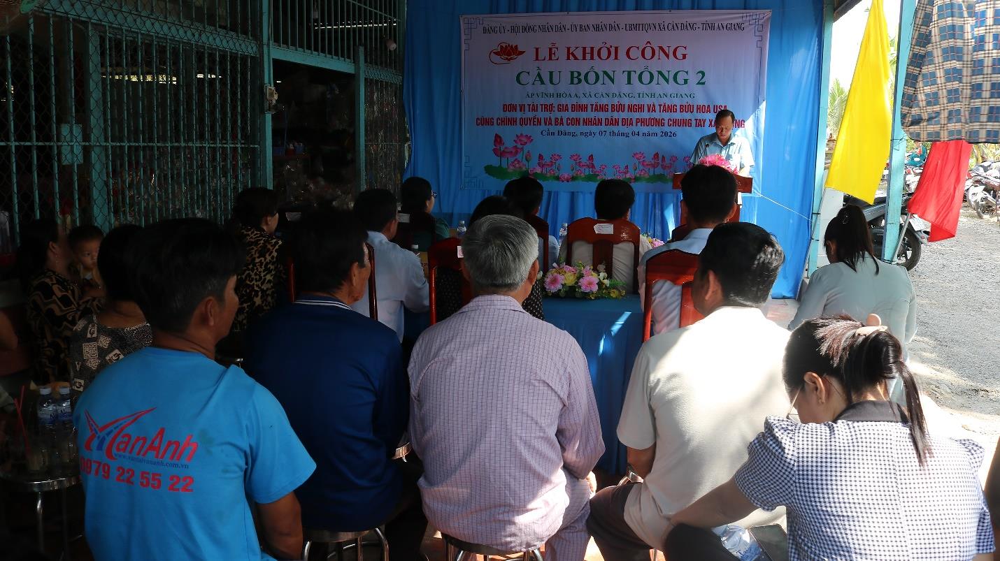 Sáng ngày 07/04/2026, UBND xã Cần Đăng tổ chức lễ khởi công cất mới cầu Bốn Tổng 2. Tham dự lễ khởi công, về phía đại diện nhà tài trợ đến từ Thành phố Hồ Chí Minh có Đại đức Thích Trúc Nhân; ông Phạm Văn Mãi, đơn vị thi công. Về phía lãnh đạo xã An Châu có ông Lê Hồ Ngọc Trung, Phó Bí thư Thường trực Đảng ủy xã; Ông Tạ Minh Trí, Phó Chủ tịch UBND xã. Về phía lãnh đạo địa phương xã Cần Đăng có: Ông Trần Tấn Phương, Bí thư Đảng ủy- Chủ tịch HĐND xã; Ông Nguyễn Duy Tân, Phó Bí thư Thường trực Đảng ủy xã; Bà Dương Nguyễn Chân Phương, Phó Bí thư Đảng ủy- Chủ tịch UBND xã.
