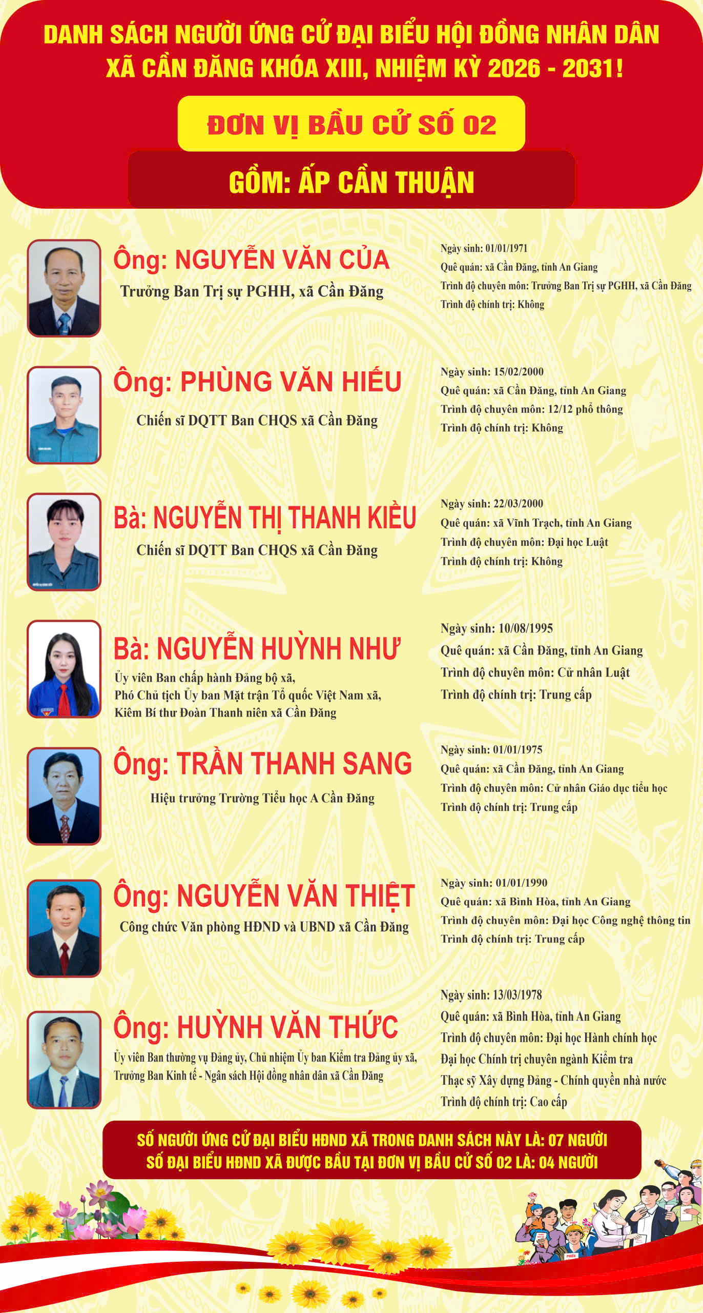 DANH SÁCH NGƯỜI ỨNG CỬ ĐẠI BIỂU HỘI ĐỒNG NHÂN DÂN XÃ CẦN ĐĂNG KHÓA XIII, NHIỆM KỲ 2026-2031