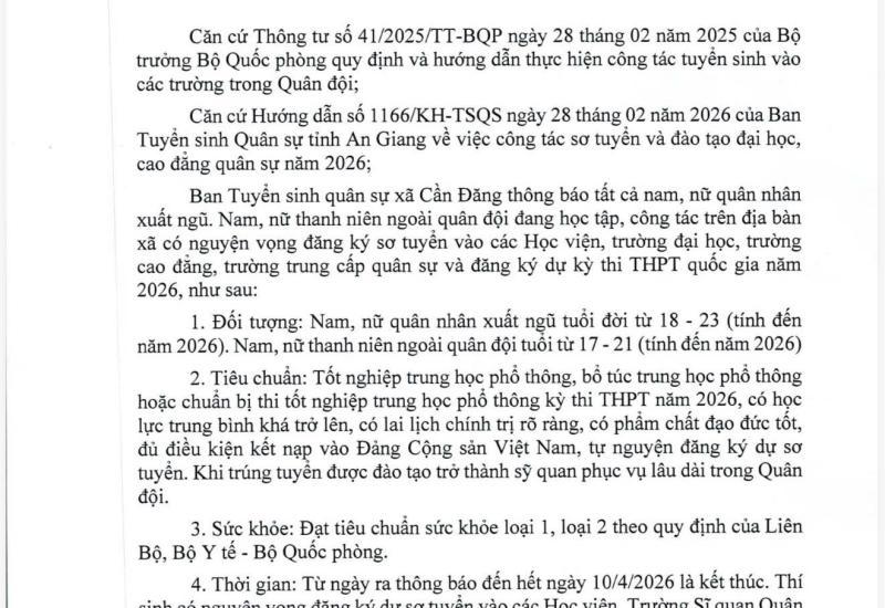 THÔNG BÁO VỀ VIỆC TẬP CHUNG CÔNG DÂN TRÚNG TUYỂN NGHĨA VỤ QUÂN SỰ VÀ THỰC HIỆN NGHĨA VỤ THAM GIA CÔNG AN NHÂN DÂN NĂM 2026 24/02/2026 THÔNG BÁO Về việc tập chung công dân trúng tuyển nghĩa vụ quân sự và thực hiện nghĩa vụ tham gia công an nhân dân năm 2026 Read more