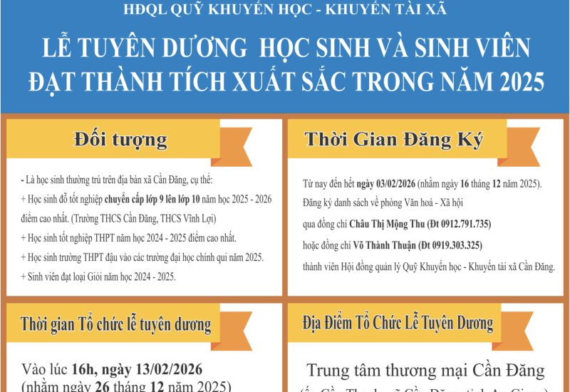 Cần Đăng triển khai kế hoạch tuyên dương học sinh và sinh viên đạt thành tích xuất sắc trong năm 2025 22/01/2026 Cần Đăng triển khai kế hoạch tuyên dương học sinh và sinh viên đạt thành tích xuất sắc trong năm 2025 Read more