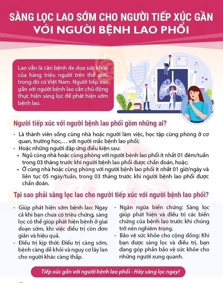 Đối tượng tham gia chương trình khám sức khỏe, sàng lọc sớm các bệnh về phổi, bệnh liên quan đến đường hô hấp là tất cả những người dân tiếp xúc và sinh sống trong gia đình với người bệnh lao, người có họ khạc đờm trên 2 tuần, sốt không rõ nguyên nhân trên 2 tuần, người có thể trạng gầy gò, có biểu hiện giảm sút cân nặng, ra mồ hôi đêm, người đã từng điều trị lao, người mắc các bệnh có hen suyễn hay tắc nghẽn phổi mãn tính, bụi phổi, người có bệnh tim mạch, tiểu đường, bệnh thận mãn tính, người có hút thuốc, sử dụng rượu bia, người già trên 60 tuổi.