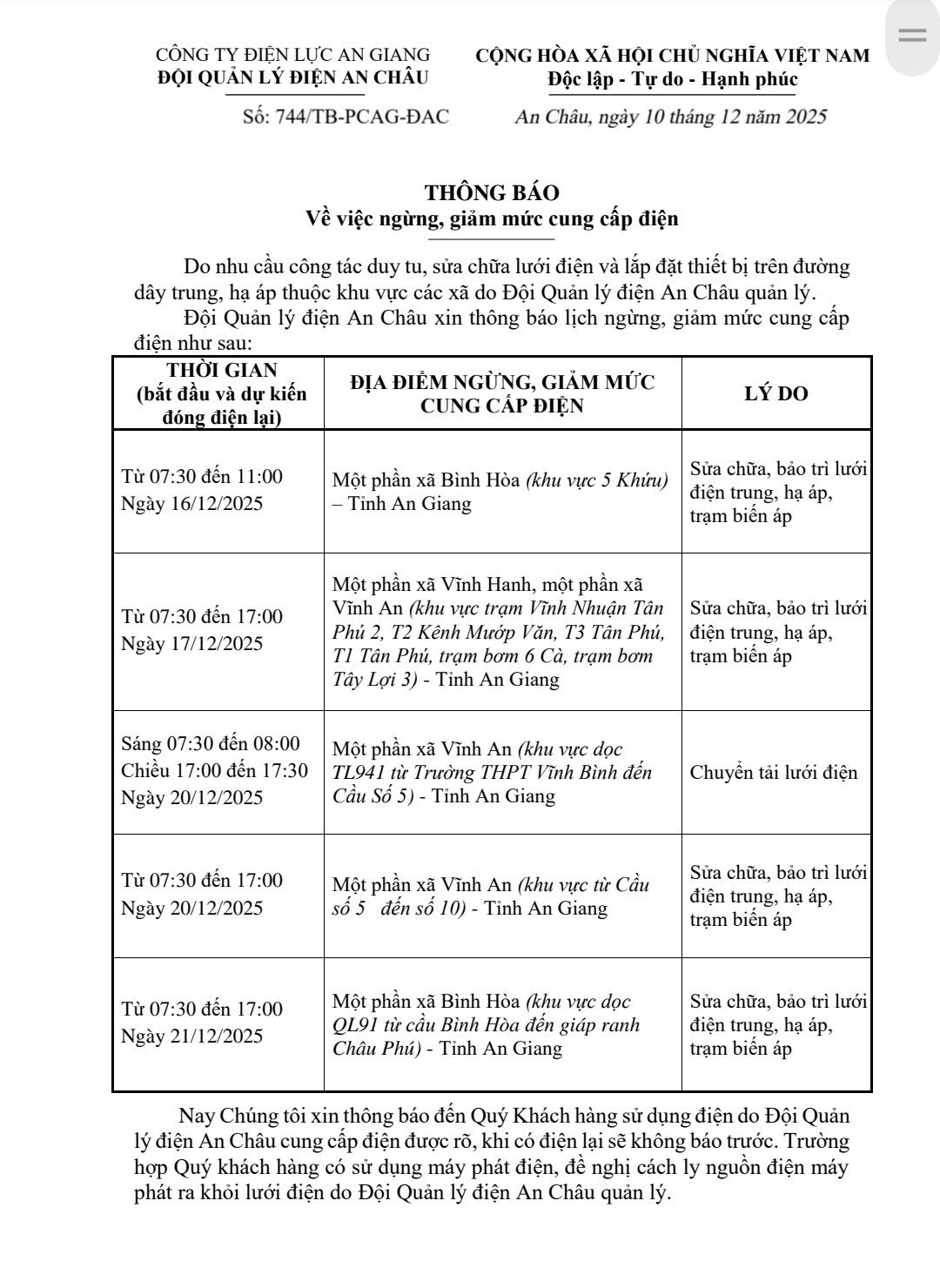 THÔNG BÁO NGỪNG, GIẢM MỨC CUNG CẤP ĐIỆN