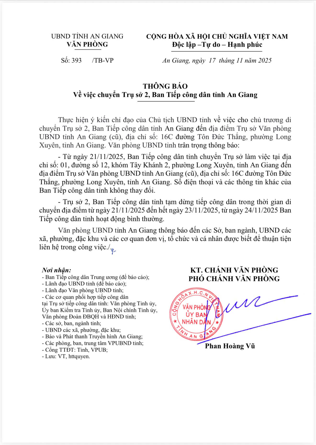 THÔNG BÁO Về việc chuyển Trụ sở 2, Ban Tiếp công dân tỉnh An Giang