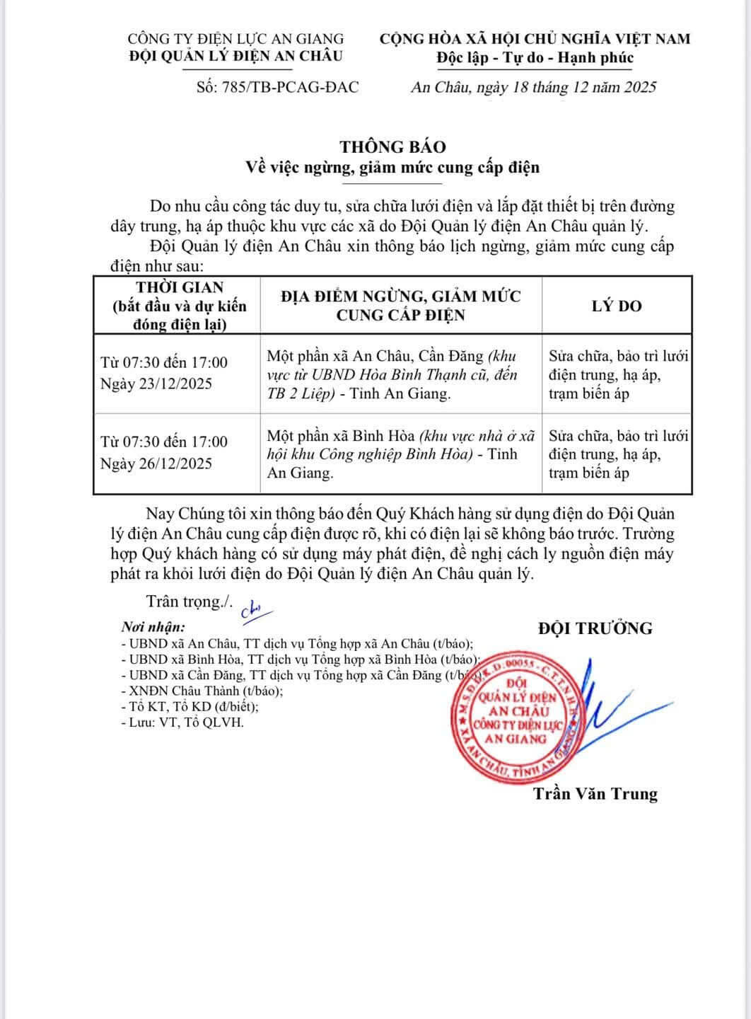 THÔNG BÁO VỀ VIỆC NGỪNG, GIẢM CUNG CẤP ĐIỆN