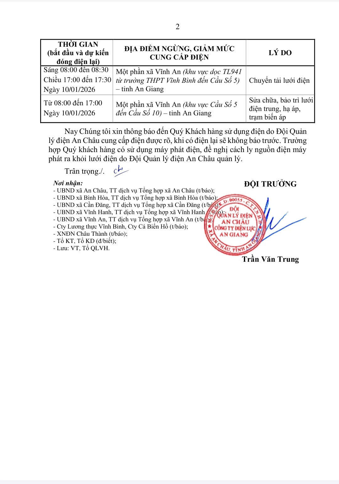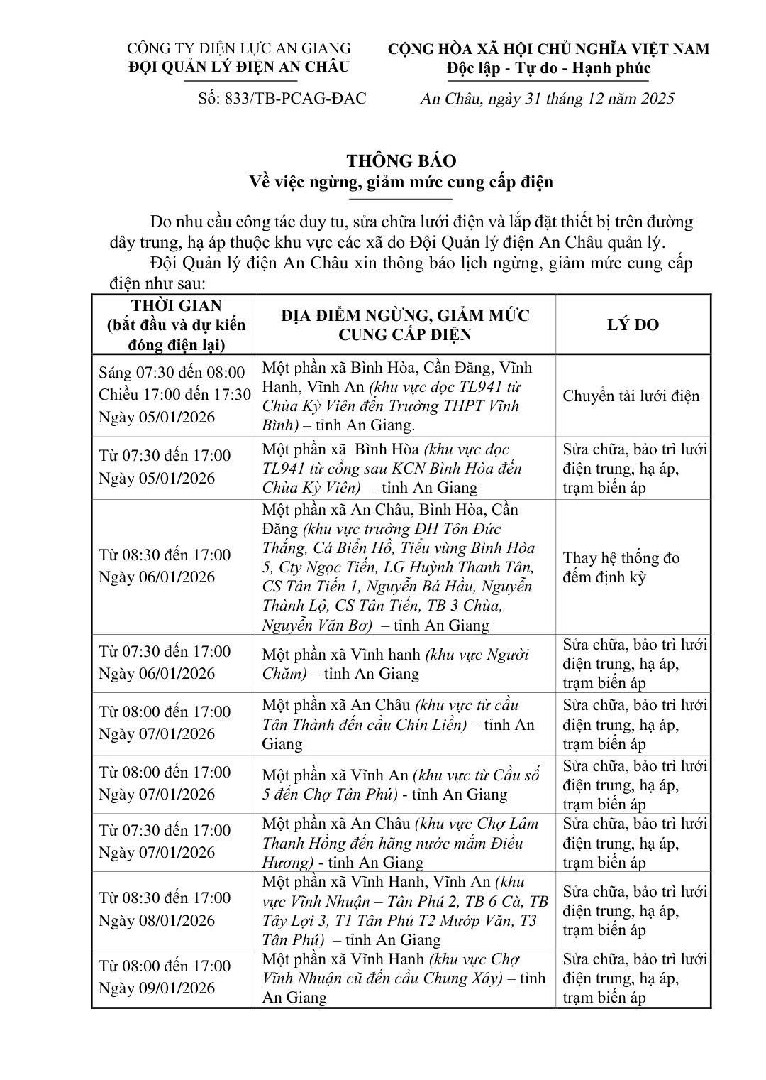 THÔNG BÁO VỀ VIỆC NGỪNG, GIẢM CUNG CẤP ĐIỆN