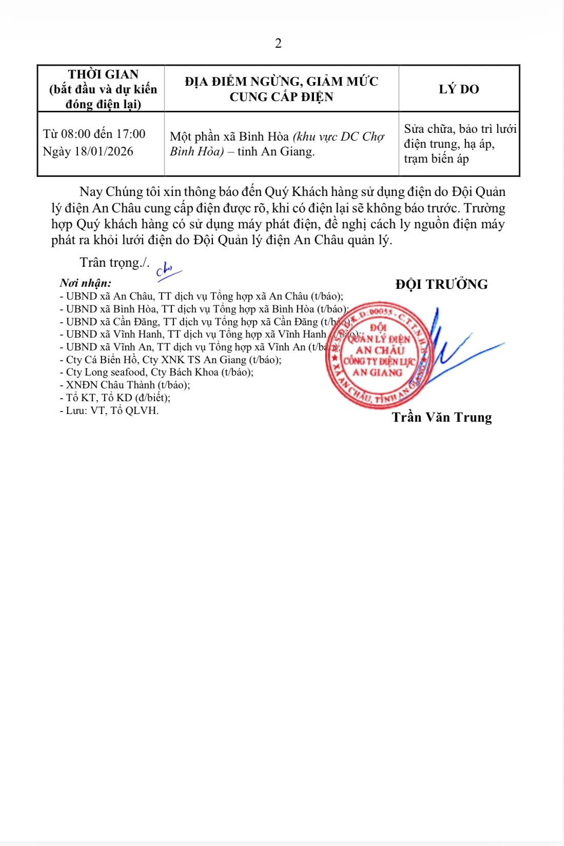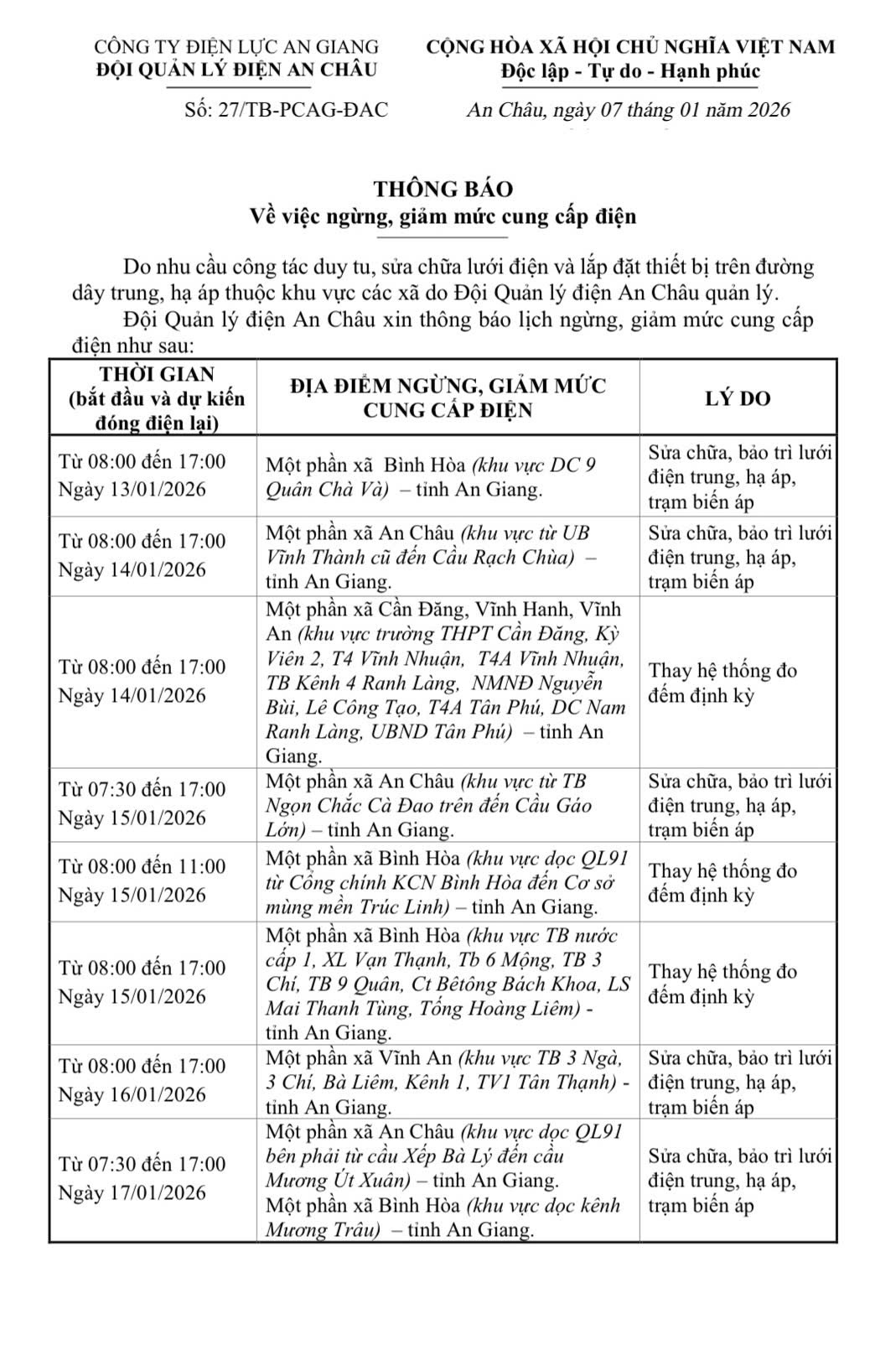 THÔNG BÁO VỀ VIỆC NGỪNG, GIẢM MỨC CUNG CẤP ĐIỆN