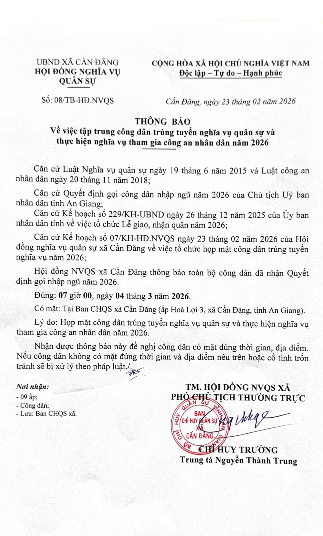 THÔNG BÁO VỀ VIỆC TẬP CHUNG CÔNG DÂN TRÚNG TUYỂN NGHĨA VỤ QUÂN SỰ VÀ THỰC HIỆN NGHĨA VỤ THAM GIA CÔNG AN NHÂN DÂN NĂM 2026