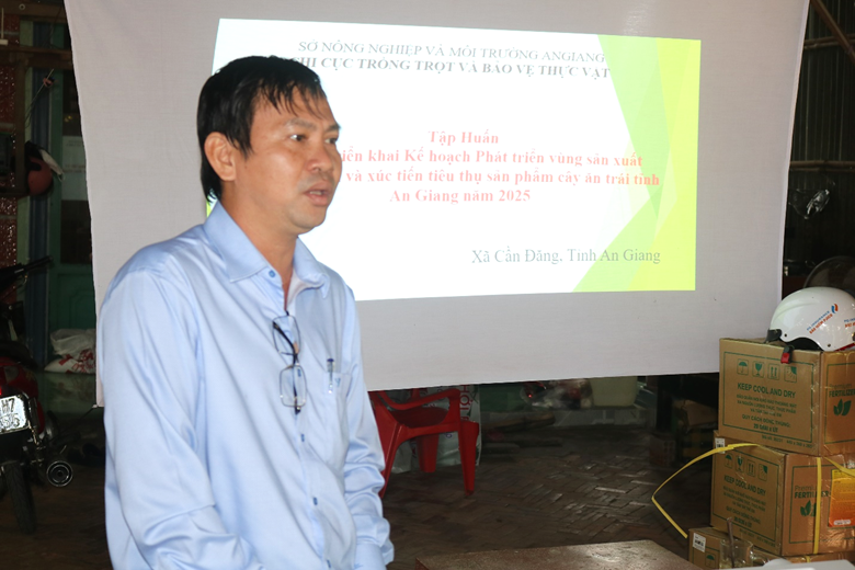 Nhằm hỗ trợ nông dân, doanh nghiệp ở địa bàn xã thực hiện hiệu quả các chương trình phát triển nông nghiệp, nông thôn trong tình hình mới, chiều ngày 28/11/2025, tại ấp Vĩnh Hòa A, xã Cần Đăng, Trạm Kỹ thuật Nông nghiệp khu vực An Châu tổ chức lớp tập huấn triển khai kế hoạch phát triển vùng sản xuất chuyên canh và xúc tiến tiêu thụ sản phẩm cây ăn trái cho 35 nông dân.